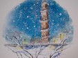 Silvia Ugolini ha catturato la severa eleganza della struttura religiosa, il campanile della Chiesa di San Lorenzo, ma l’ha immersa in un contesto di pura fantasia festiva. La torre, con i suoi mattoni e la sua storia secolare, è il solido ancoraggio di questa scena eterea. Le guglie e gli archi della cella campanaria sono delineati con cura, ma ogni linea sembra vibrare nel paesaggio innevato. È una visione di Cairo Montenotte in cui il tempo sembra essersi fermato, non per il freddo, ma per la magia.