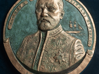 La medaglia, realizzata dallo stesso Marchese su commissione dell’amministrazione comunale di Stella raffigura il principe Alberto I Grimaldi di Monaco, noto oceanografo vissuto tra XIX sec. e XX sec., cui è dedicato un museo nel territorio del principato. Un’opera realizzata in ceramica, e policromata con pigmenti naturali ad encausto: il busto risalta, in abito ottocentesco su uno sfondo azzurro mare, un richiamo alle passioni e alla professione del prozio dell’attuale Principe in carica.