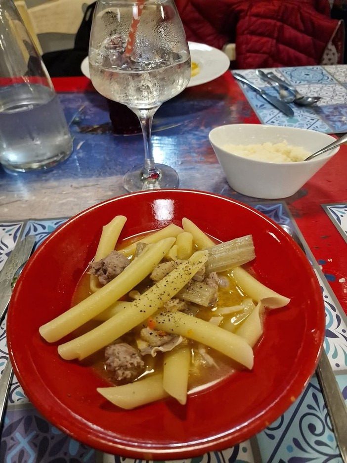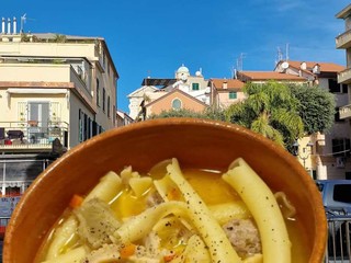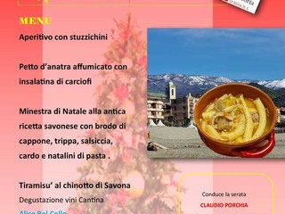 Il cuore della serata è però la grande protagonista del Natale savonese: la Minestra di Natale, proposta nella sua antica ricetta. Un piatto che è molto più di una tradizione: un rito familiare che si rinnova. Nel piatto trovano posto il brodo di cappone, la trippa, la salsiccia, il cardo e i celebri Natalini, la pasta lunga tipica delle feste. Una combinazione ricca, sontuosa, che racconta l'identità di una cucina nata tra mare e entroterra, sobria ma capace di sorprendere con profondità e intensità di sapori.