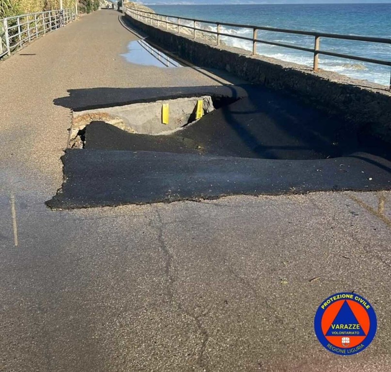 Il cedimento del tracciato stradale si era verificato a 600 metri circa dall'inizio del percorso ciclopedonale lato comune varazzino, a seguito di un significativo scalzamento delle fondazioni del muro a sostegno della stessa viabilità causato dall’azione erosiva del mare.