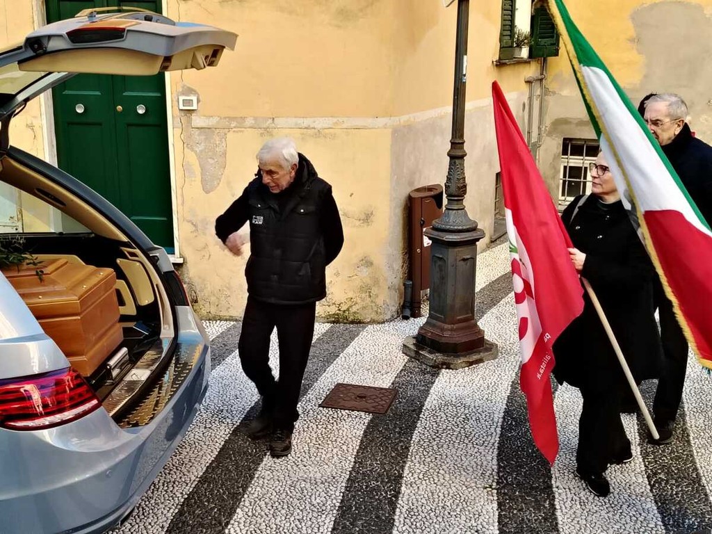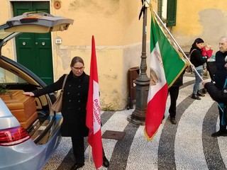 Infine il saluto delle bandiere dell'Psi e dell'Anpi di Stella e Albissola che sventolano per lei per l'ultimo viaggio.
