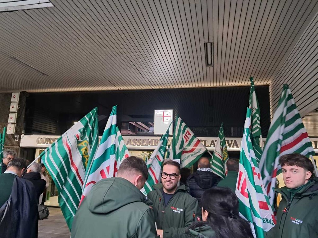 La protesta di Cgil, Cisl e Uil è cominciata stamane con il presidio sotto la Regione, dove un primo confronto con il presidente Bucci non ha però poi avuto conseguenze sull'iter di approvazione di quanto già scritto.