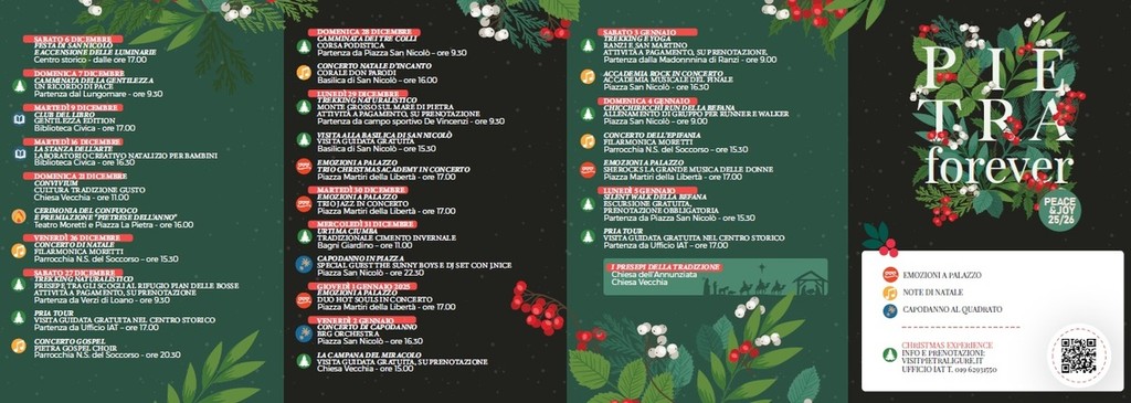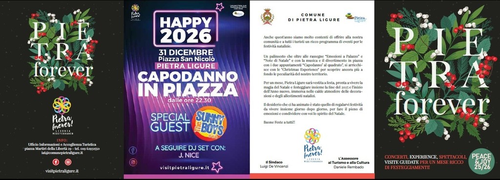 Con “Pietra Peace&Joy”, “Happy 2026 - Capodanno in Piazza”, “Convivium” e una programmazione di oltre venticinque iniziative - tra conferme e novità che spaziano dalla tradizione, alla cultura, alla musica, alle esperienze, allo sport, all’enogastronomia - ritorna il palinsesto degli eventi natalizi promossi e organizzati dal Comune di Pietra Ligure.