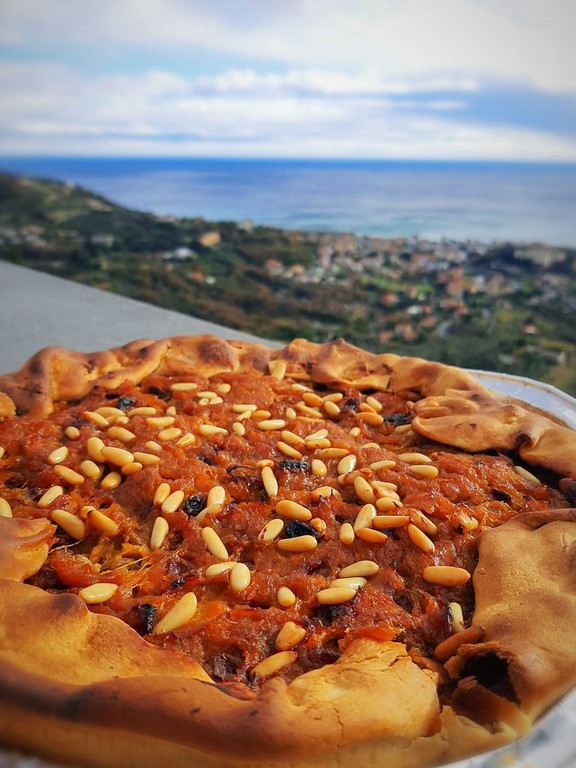 Verdure, in genere classificate come contorni o protagoniste di zuppe e minestroni, che diventano elemento essenziale di raffinati dolci. Le "trombette", che in estate si usano come zucchini verdi, a tutti gli effetti frutti ancora acerbi, a fine estate/inizio autunno, a piena maturazione, diventano la zucca “trombetta”, molto lunga e di colore tendente all'arancio. Ed è questa che serve per il dolce pietrese, la Torta di Zucca, tipica delle festività natalizie, ancora oggi preparata da moltissime famiglie e da diversi forni del centro storico. Rientra, probabilmente, nella lunga serie delle "gattafure", le antiche torte di verdura tipiche della cucina medievale genovese e ligure, e che vede nella Pasqualina la sua massima espressione. Il fatto che sia dolce non deve stupire affatto, perché lo zucchero, tra Medioevo e Rinascimento, è uno dei sapori più ricercati e diffusi, usato anche in abbinamenti che oggi potremmo considerare arditi e quando mancava lo zucchero, vista la stagione, il dolce veniva dato dai cachi, molto zuccherini, e dello stesso colore della zucca. La pasta è quella tipica delle torte liguri, la "pasta matta" (farina tipo 0, acqua, olio e, in questo caso, un goccio di Marsala o di un passito ligure), mentre il ripieno vede la zucca bollita e strizzata (la tradizione pietrese vuole che la zucca, bollita la sera precedente, resti appesa in un sacchetto di cotone per tutta la notte, in modo da perdere l'acqua in eccesso), uvetta, pinoli e zucchero. L'impasto si sistema nella sfoglia, non si copre ma si spalma come fosse una crostata, e si inforna. Il risultato è un dolce semplice, rustico, dal sapore caldo e avvolgente. La versione di Ranzi vede l’aggiunta, nel ripieno, della farina di ceci che ne aumenta la “rusticità”. La versione della Riviera è più ricca, aromatizzata dal rum e dal marsala e dalla mandorla, che le danno un gusto più elegante.