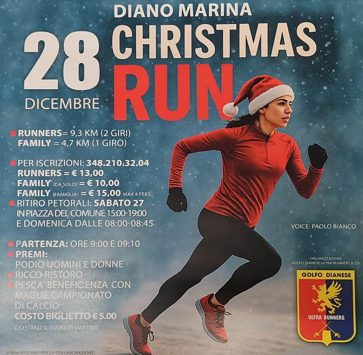La manifestazione prenderà il via alle 9 con partenza dalla piazza principale di Diano Marina. Sono previsti due percorsi. Per i Runners: distanza 9,3 km e quota di iscrizione a 13 euro; Family Run sulla distanza di 4,7 km e quota a 15 euro (fino a un massimo di 4 persone). Un’occasione pensata sia per gli atleti sia per le famiglie, per vivere una mattinata di sport all’aria aperta all’insegna della solidarietà. Il ritiro dei pettorali è previsto per sabato 27 dicembre in piazza del Comune (come indicato nella locandina ufficiale). Per informazioni, prenotazioni e dettagli organizzativi è possibile contattare direttamente Cristian Mallardo al 348 2103204.