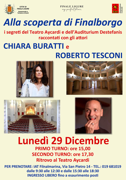 Lunedì pomeriggio a Finalborgo un incontro speciale con due grandi attori italiani, Chiara Buratti e Roberto Tesconi, che racconteranno insieme all’architetto Roberto Grossi e al pianista Alessio Briano, curiosità e aneddoti si sulla loro professione di attori sia su due straordinari spazi monumentali: il Teatro Aycardi e dell’Auditurium Destefanis.