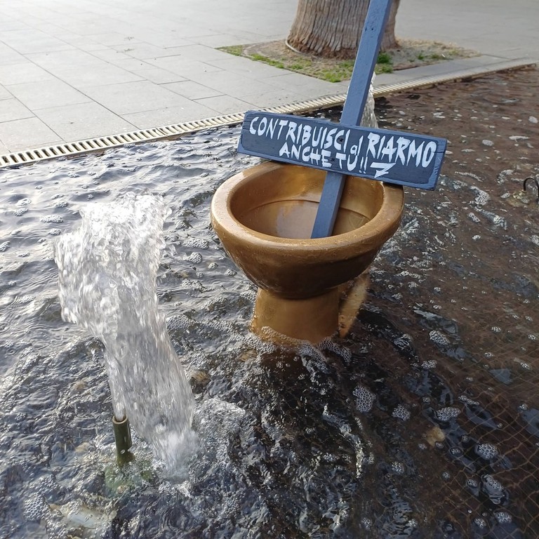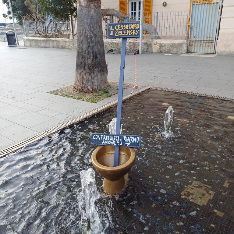 Queste le frasi, scritte su due cartelli e posizionate all'interno di un water pitturato d'oro collocato all'interno della fontana sulla passeggiata a ponente di Varazze.