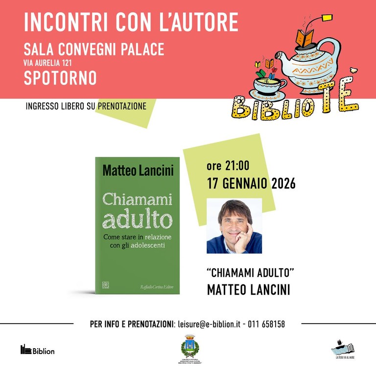 Il Comune di Spotorno – Assessorato alla Cultura e Biblioteca Civica “C. Sbarbaro” – in collaborazione con Biblion Beni Culturali e Ambientali s.c. e la libreria “La Dora va al mare”, invita la cittadinanza a partecipare all’incontro con Matteo Lancini, in programma sabato 17 gennaio 2026 alle ore 21.00 presso la Sala Convegni Palace (via Aurelia 121, Spotorno).