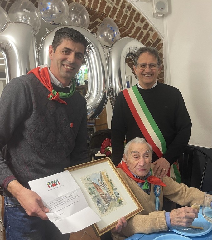 Immancabili gli auguri della sezione ANPI di Cairo Montenotte, rappresentata per l’occasione da Alberto Poggio, che ha portato il saluto della Presidente Leda Bertone: "Da coraggioso fanciullo, staffetta portaordini, partigiano combattente a lavoratore e cittadino antifascista coerente con i principi di libertà e democrazia per i quali ha combattuto. A lui va il nostro ringraziamento".