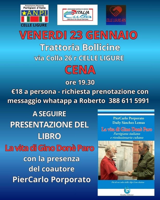 Venerdì 23 gennaio a Celle Ligure si terrà una cena di solidarietà seguita dalla presentazione del libro “La vita di Gino Donè Paro. Partigiano italiano e rivoluzionario cubano”, di Piercarlo Porporato e Daily Sánchez Lemus.