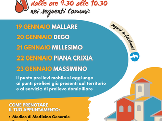 Lunedì 19 gennaio l’unità mobile dedicata ai prelievi del sangue sarà a Mallare, Martedì 20 a Dego, Mercoledì 21 a Millesimo, Giovedì 22 a Piana Crixia e Venerdì 23 a Massimino. L’orario di attività sarà sempre dalle ore 9.30 alle 10.30.