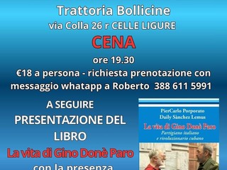 Venerdì 23 gennaio a Celle Ligure si terrà una cena di solidarietà seguita dalla presentazione del libro “La vita di Gino Donè Paro. Partigiano italiano e rivoluzionario cubano”, di Piercarlo Porporato e Daily Sánchez Lemus.