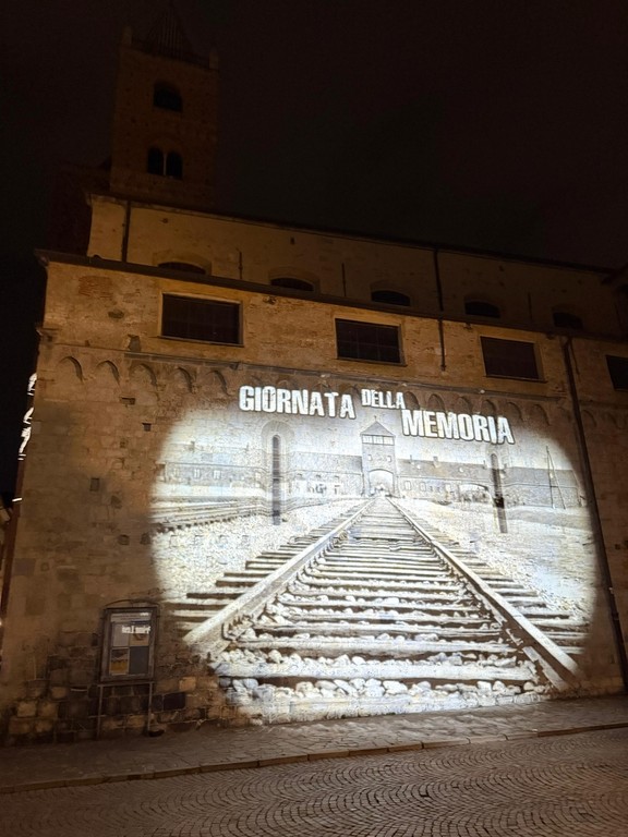 Come di consueto, in Piazza IV Novembre, sulle facciate laterali della chiesa di Santa Maria in Fontibus e della Cattedrale di San Michele, saranno proiettate le immagini dell’ingresso del campo di concentramento di Auschwitz e una frase di Primo Levi. Sulla Torre Civica verrà invece proiettata l’immagine di una rosa con le spine, simbolo di memoria e sofferenza.