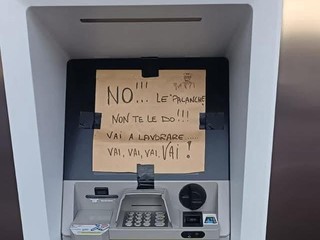 Questo il cartello posizionato ironicamente sul nuovo Atm postamat di Valleggia installato a metà dicembre dopo mesi e mesi di attesa che però non funziona tra le proteste dei quilianesi.