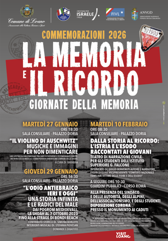 L'Associazione Italia Israele di Savona organizza, con il patrocinio del Comune di Loano e in collaborazione con Cristiani per Israele, un incontro per riflettere sulla Giornata della Memoria della Shoah oggi, il nuovo antisemitismo e le radici dell'odio.