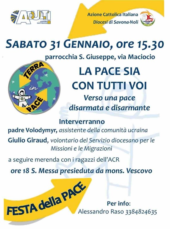 Sabato 31 gennaio a Savona, nella Parrocchia San Giuseppe, nel quartiere Oltreletimbro, l'Azione Cattolica diocesana promuove la "Festa della Pace", una giornata di eventi per ragazzi e adulti. Da mezzogiorno alle ore 19 l'Azione Cattolica dei Ragazzi invita i più giovani al pranzo al sacco e ad un pomeriggio di giochi.