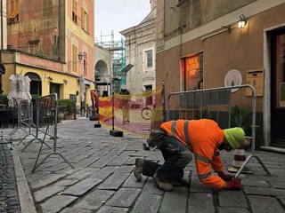 La pioggia persistente degli ultimi giorni sta facendo emergere alcune criticità strutturali alla pavimentazione in basoli del centro, all’interno delle mura, di Finalborgo.