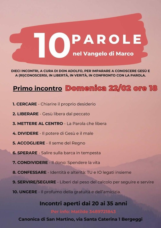 Domenica 22 febbraio alle ore 18 presso la canonica della Parrocchia San Martino Vescovo, in via santa Caterina 1, si terrà il primo di dieci incontri su "10 parole nel Vangelo di Marco", a cura del parroco don Adolfo Macchioli. Lo scopo è "imparare a conoscere Gesù e (ri)conoscersi in libertà, in verità e in confronto con la Parola", dicono gli organizzatori.