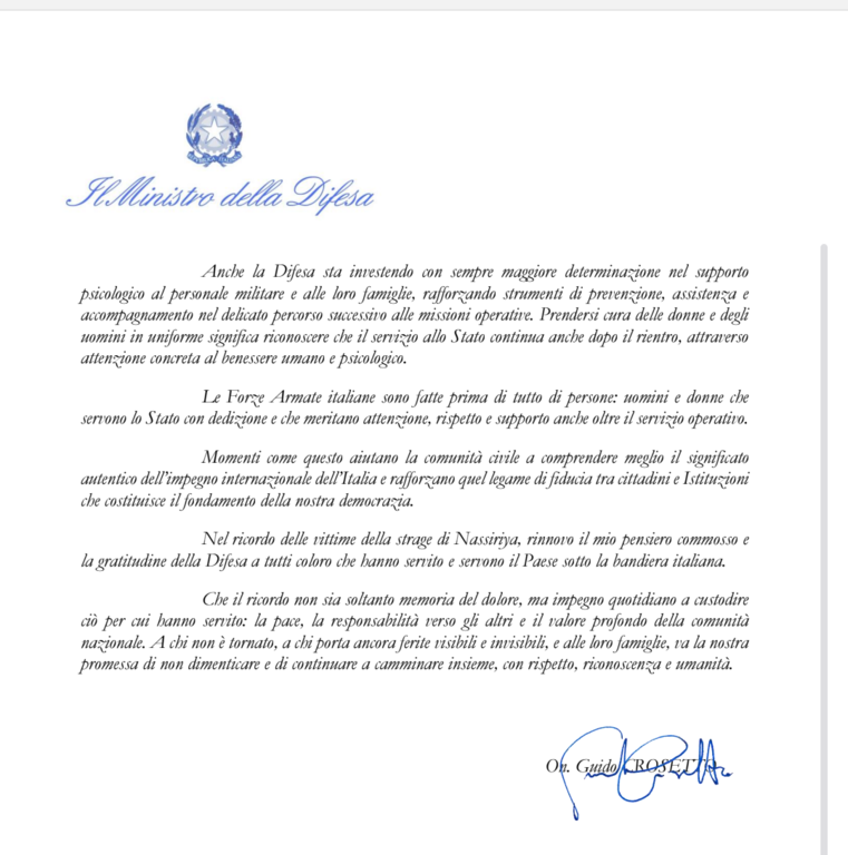 Il servizio per il Paese non si conclude con il rientro a casa. Questo ha voluto ribadire l’intervento istituzionale: le ferite emotive e i traumi post-missione richiedono percorsi di resilienza e cura che coinvolgano non solo i soldati, ma anche le loro famiglie. In questo delicato scenario, l'operato della dottoressa Bonino è stato indicato come un esempio virtuoso di assistenza qualificata.