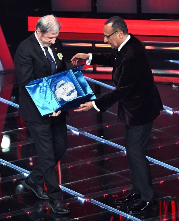 "Il premio di quest'anno è realizzato in filigrana di Campo Ligure – ha detto il presidente – e raffigura una caravella con la croce di San Giorgio sulle vele spiegate, simbolo della tradizione ligure e del legame storico tra il Festival e il territorio regionale. Il fiore che porto all'occhiello - ha proseguito - è il ranuncolo Giannina, realizzato per l'Istituto Giannina Gaslini di Genova".