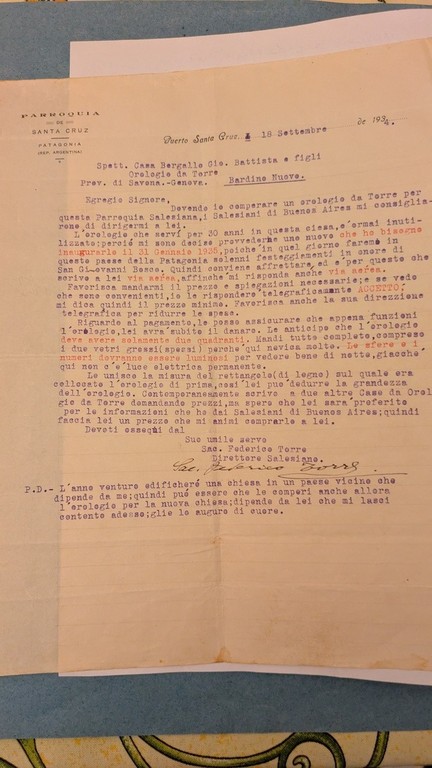 Il film racconta la storia di un orologio da torre ordinato dal Padre Salesiano Federico Torre e spedito nel 1934 dall’officina Bergallo di Bardino Nuovo alla missione salesiana di Puerto Santa Cruz nella Patagonia Argentina e ritrovato alcuni anni fa ancora installato sul campanile della Chiesa della Esaltazione della Santa Croce.