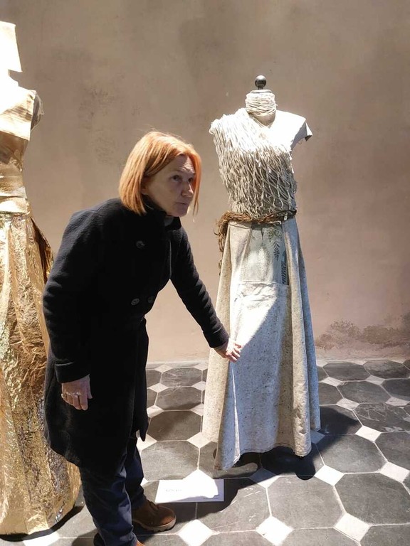 I suoi costumi/archetipo – la Sposa, la Nomade, la Regina e l’Aliena – diventano simboli di circolarità, ecologia e rinascita. Particolarmente significativa l’opera dedicata alla Sposa, il cui abito è realizzato con sacchetti di plastica raccolti nell’arco di un anno e rielaborati fino a evocare pizzi e tulle.