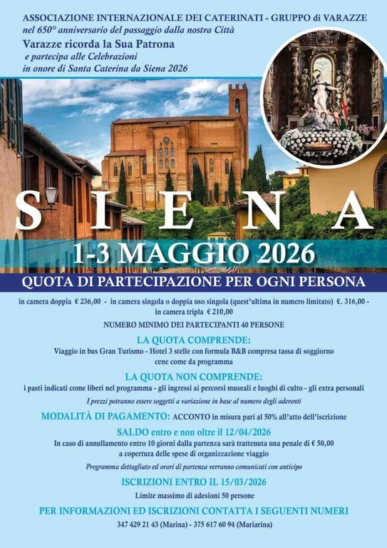 Per tale circostanza il gruppo di Varazze dell'Associazione Internazionale Caterinati organizza un pellegrinaggio dall'1 al 3 maggio. Il primo giorno, venerdì, comprenderà il ritrovo dei partecipanti in mattinata, la partenza per la Toscana con pullman gran turismo, il pranzo libero lungo il percorso, la sistemazione in albergo e la cena al ristorante. Tempo e traffico permettendo, si potrà visitare il borgo medievale Monteriggioni, citato da Dante Alighieri nella "Divina Commedia" e che conserva ancor oggi intatta l'antica cerchia muraria, le sue torri e la pieve di Santa Maria Assunta.
