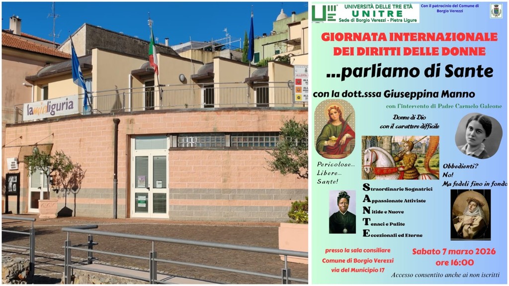 L'Unitre Borgio Verezzi e Pietra Ligure organizza un pomeriggio formativo sabato 7 marzo, alle ore 16:00, presso la sala consiliare del Comune di Borgio Verezzi, in via del Comune 17, con la conferenza della Dott.ssa Giuseppina Manno sul tema “… parliamo di Sante”, che non sono supereroi inarrivabili, ma donne che hanno amato Dio e il prossimo in modo straordinario, condividendo fatiche e debolezze umane, in sintesi la "santa" rappresenta un ponte tra l'umanità e il divino, una testimonianza di come l'amore e la fede possano trasformare la vita concreta.