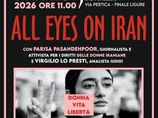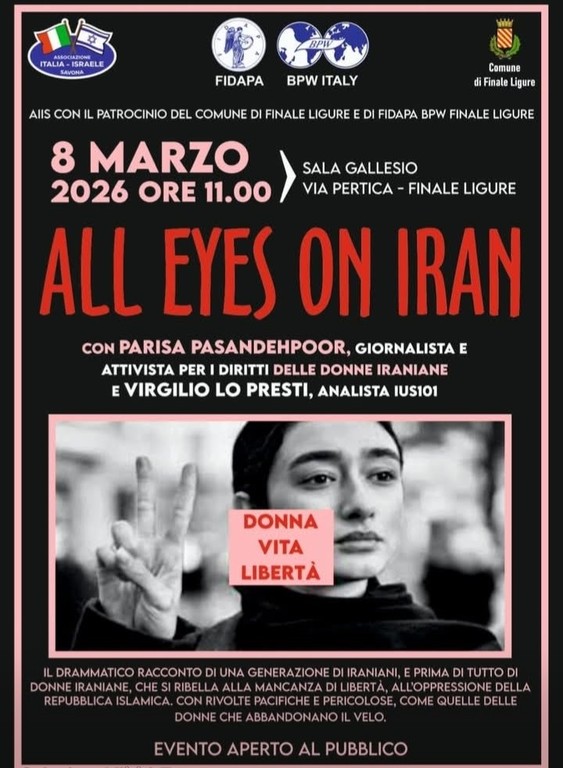 Domenica 8 marzo a Finale Ligure, alle ore 11 nella Sala Gallesio in via Pertica, in occasione della Giornata internazionale della donna, si terrà l'evento manifestazione "All eyes on Iran", organizzato dall'associazione Italia Israele di Savona unitamente a Fidapa BPW Italy, con il patrocinio del Comune di Finale Ligure.