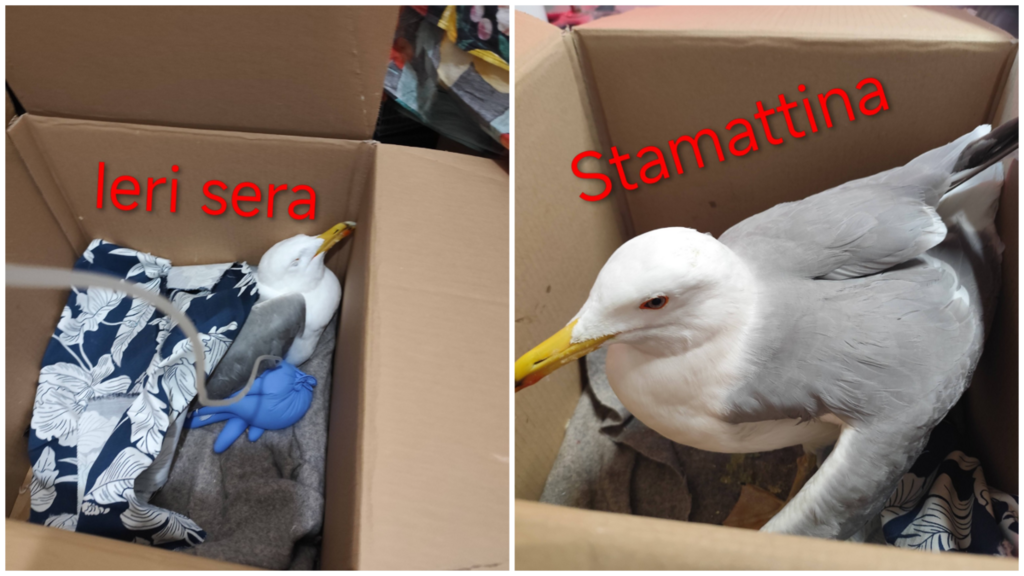 Questa mattina il gabbiano è vigile e reattivo, seppur ancora un po’ debole. “Probabilmente ieri ha ‘festeggiato’ un po’ troppo la Festa della Donna… alzando l’ala più del dovuto”, commentano con una punta di ironia i volontari.