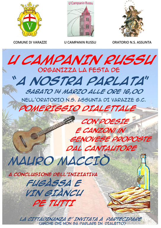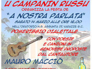 Sabato 14 marzo alle ore 16 presso l’oratorio di N.S. Assunta a Varazze l’associazione culturale “U Campanin Russu” organizza la prima “Festa de a nostra parlata” a ingresso gratuito.
