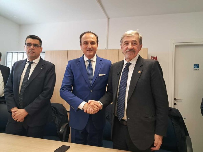 Con Bucci e Cirio il segretario generale dell'Autorità di sistema Tito Vespasiani, presidente della Provincia di Savona Pierangelo Olivieri e delle delle Provincie di Alessandria e Cuneo, Luigi Benzi e Luca Robaldo.