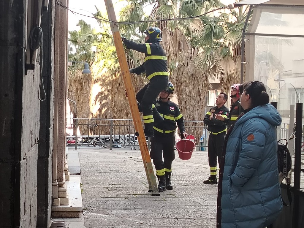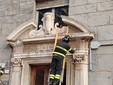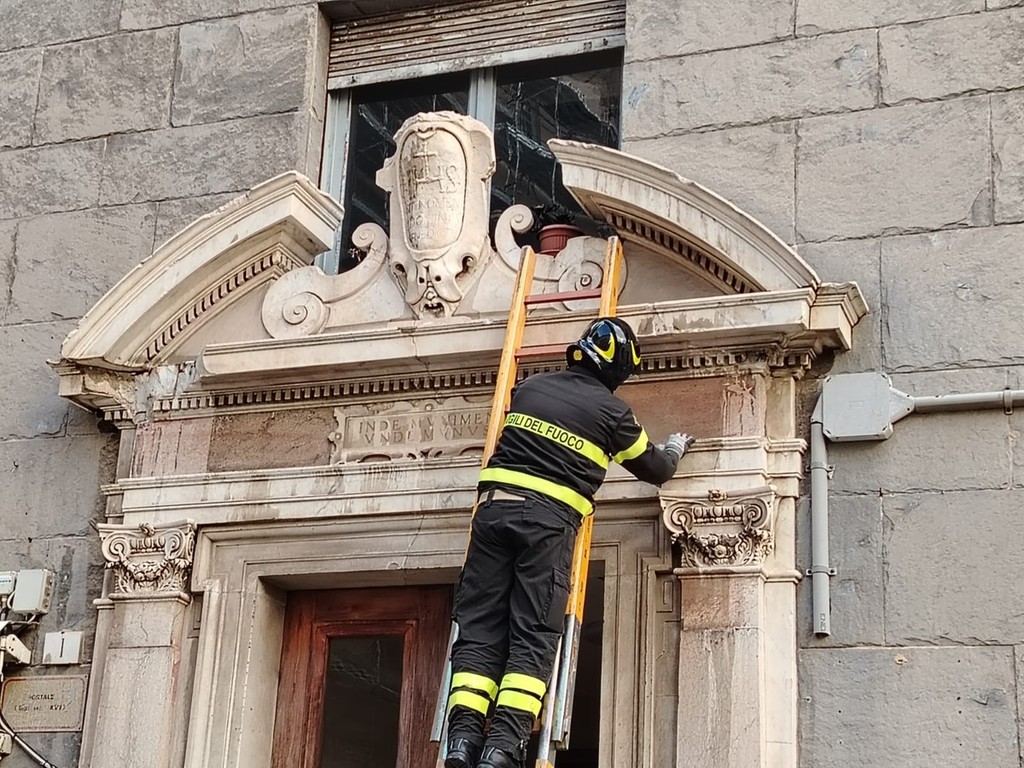 Crolla sul pavimento una porzione dell'ingresso di un palazzo storico di Piazza dei Della Rovere e scatta l'intervento dei vigili del fuoco.
