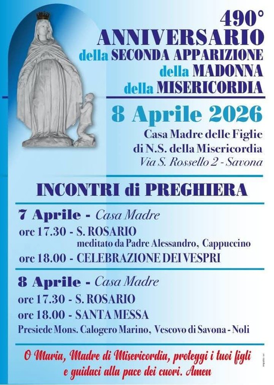 Le Figlie di Nostra Signora della Misericordia si preparano a celebrare il 490esimo anniversario della seconda apparizione della Madonna della Misericordia con due incontri di preghiera dalle ore 17:30 nella Casa Madre in via santa Maria Giuseppa Rossello 2