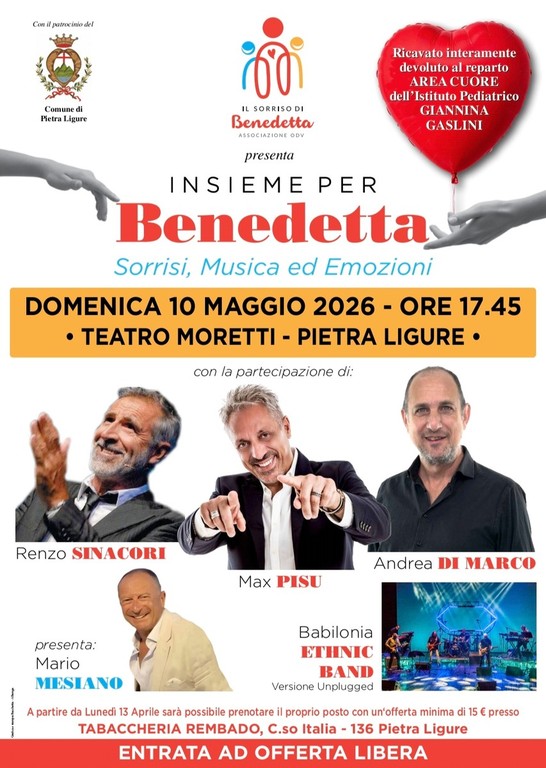 Domenica 10 Maggio alle ore 17,45 il Teatro Moretti di Pietra Ligure ospiterà “Insieme per Benedetta”. Un nuovo importante evento benefico all’insegna della musica, della comicità ma soprattutto del sostegno.