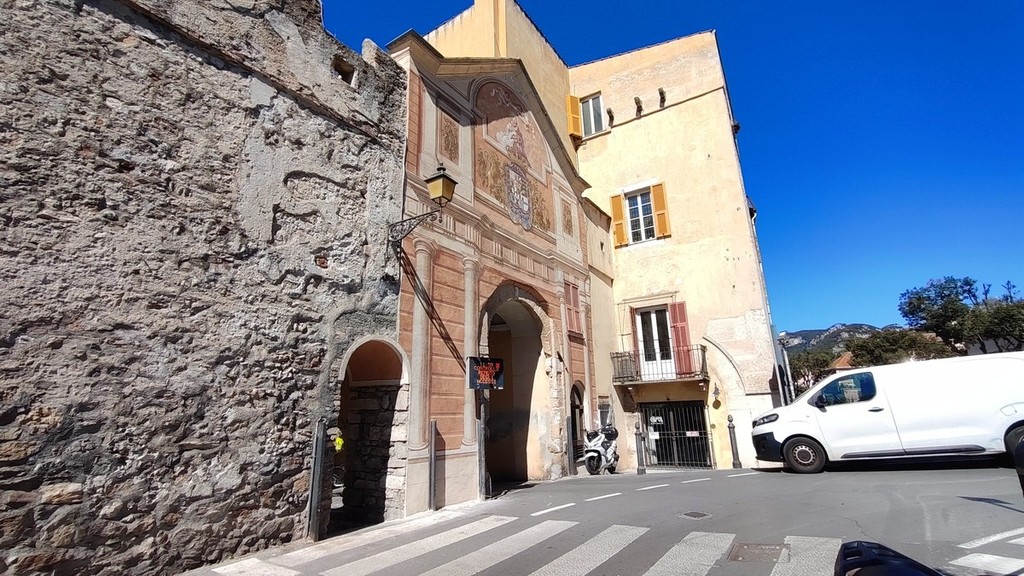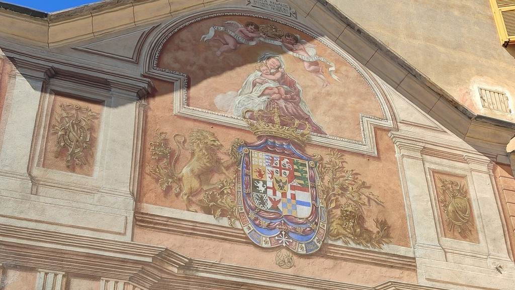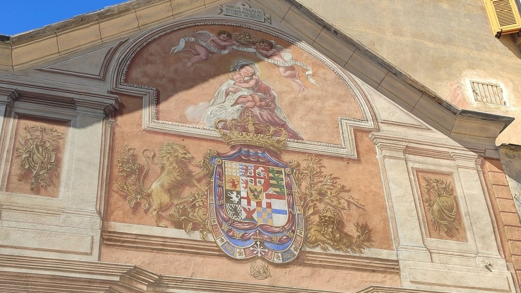 Il restauro ha anzitutto riportato gli affreschi alla loro versione originaria, restituendo coerenza e autenticità all’impianto decorativo risalente al XIX secolo. Al suo centro si trova un grande stemma della famiglia Savoia, ai cui lati sono stati ripristinati gli antichi scudi, sormontato da una rappresentazione della Madonna del Carmelo, protettrice del Borgo. Queste risalgono probabilmente all’inizio del Settecento.