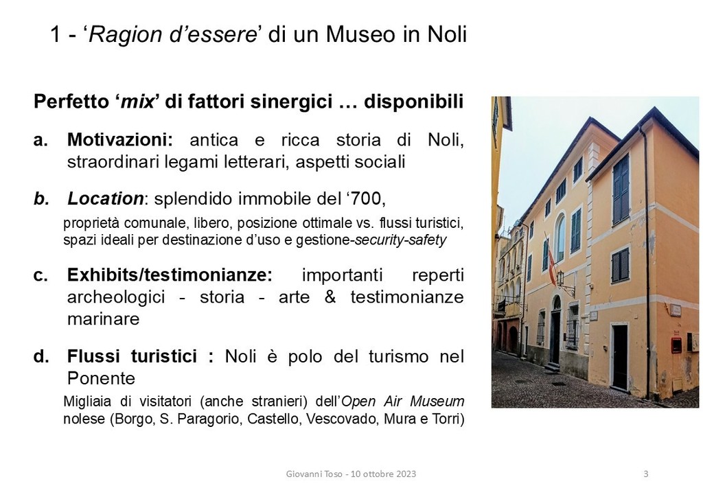 “Sarebbe di grande valore per la città e per il comprensorio attorno a Noli la creazione di un polo di studio e divulgazione culturale aperto alle decine di migliaia di turisti, studiosi e studenti”, si legge ancora nella lettera, che richiama il forte richiamo esercitato dall’“open air museum” nolese - dal borgo turrito al castello, dal vescovado alla chiesa di San Paragorio - oggi però privo di uno spazio capace di restituire una lettura organica della storia locale.