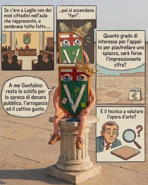 "Io c'ero a luglio con dei miei cittadini nell'aula che rappresento (durante il consiglio comunale di illustrazione del progetto.ndr) e sembrava tutto fatto... Poi si accendono 'fari' - si legge nella vignetta - Quanto grado di interesse per l'appalto per piastrellare uno spiazzo, sarà forse l'impressionante cifra? E il tecnico a valutare l'opera d'arte? A me Gonfalino resta lo schifo per lo spreco di denaro pubblico, l'arroganza ed il cattivo gusto".