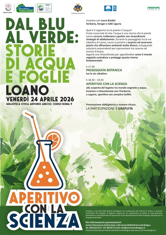 L'evento è gratuito e a numero chiuso, con prenotazione obbligatoria. La manifestazione, a cura del Centro Educazione Ambientale e alla Sostenibilità Riviera del Beigua con il patrocinio del Comune di Loano, si inserisce nell'ambito del progetto di Regione Liguria per la realizzazione di azioni di comunicazione, animazione e coinvolgimento dei giovani per la territorializzazione della Strategia regionale per lo Sviluppo Sostenibile. Per informazioni e prenotazioni è possibile contattare il Ceas Riviera del Beigua ai numeri 366.6221213 o 327.8818713 o via mail all'indirizzo info@cearivierabeigua.it.