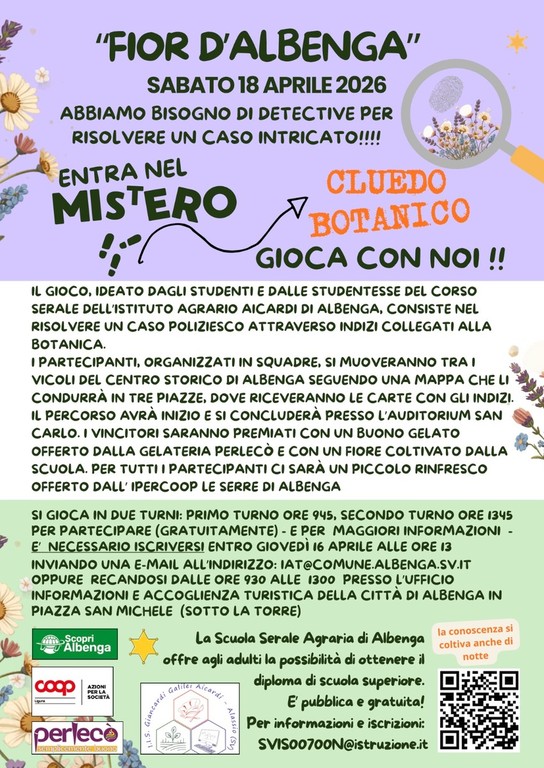 Sabato 18 aprile 2026, nell’ambito di “Fior d’Albenga”, il percorso serale dell’ Istituto agrario d'Istruzione Secondario Superiore Giancardi Galilei Aicardi propone il “Cluedo Botanico”, un originale gioco investigativo aperto a tutta la cittadinanza.