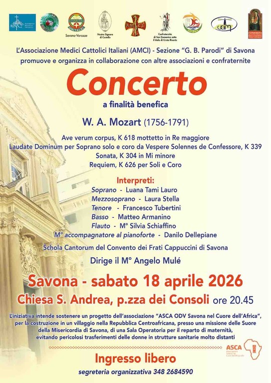 Sabato 18 aprile alle ore 20:45 nella Chiesa Sant'Andrea Apostolo, in piazza dei Consoli del Comune, si terrà un concerto benefico a sostegno della costruzione di una sala operatoria per il reparto Maternità presso una missione delle Figlie di Nostra Signora della Misericordia in un villaggio nella Repubblica Centrafricana. Il progetto dell'associazione Savona nel Cuore dell'Africa è finalizzato ad evitare pericolosi trasferimenti delle donne in strutture sanitarie molto distanti.