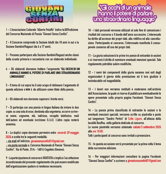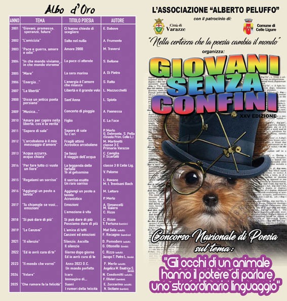 L’associazione culturale Alberto Peluffo organizza il premio nazionale di poesia Giovani Senza Confini. Ogni anno viene proposto un tema da trattare: l’edizione numero venticinque sarà dedicata ai nostri amici a quattro zampe. Infatti il tema da seguire sarà: Gli occhi di un animale hanno il potere di parlare uno straordinario linguaggio.