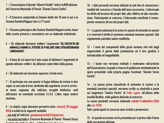 Le duplici copie dovranno pervenire entro venerdì 29 maggio 2026 a scelta tra le seguenti modalità: via mail all’indirizzo giovanisenzaconfini01@gmail.com . Via posta normale a Concorso nazionale di poesia Giovani Senza Confini, via al ponte, 31/1 – 16016 - Cogoleto - (Genova). La partecipazione al concorso è GRATUITA. La giuria selezionerà le prime tre poesie di entrambe le sezioni e si riserverà il diritto di nominare eventuali menzioni speciali. Fiore al’occhiello di questo concorso è il fatto che la poesia prima classificata di entrambe le sezioni e le menzioni speciali, verranno scritte su piastrella e poste sul Lungomare Sandro Pertini di Celle Ligure, all’altezza della località Bouffou, nella galleria dedicata al concorso. Le nuove piastrelle verranno sistemate sabato 5 settembre 2026 alle ore 18.