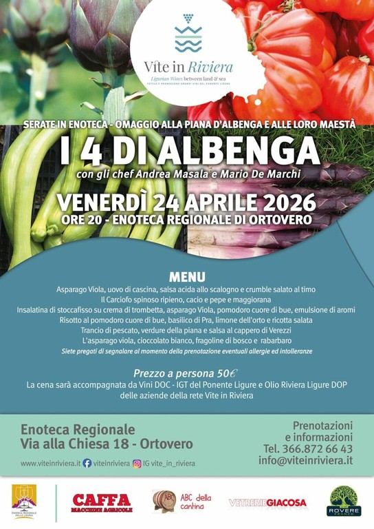 Nel frattempo continuano le serate a tema presso la sede di Ortovero dell’Enoteca Regionale della Liguria. La prossima, fissata per venerdì 24 aprile, dedicata ai 4 di Albenga e curata dagli chef Andrea Masala e Mario De Marchi, è già sold out. Presso la stessa location, più volte alla settimana, su appuntamento, si tengono degustazioni guidate con accompagnamenti di prodotti preparati con materie prime a km0.