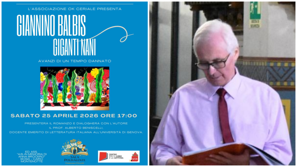 Sabato 25 aprile alle 17, nella Sala Polivalente Francesco Fizzotti, verrà presentato il romanzo “Giganti nani. Avanzi di un tempo dannato” di Giannino Balbis. Si tratta di un nuovo appuntamento culturale promosso dal Comune di Ceriale – Assessorato alla Cultura e dalla Biblioteca Civica Agostino Sasso, in collaborazione con l’Associazione OK Ceriale.