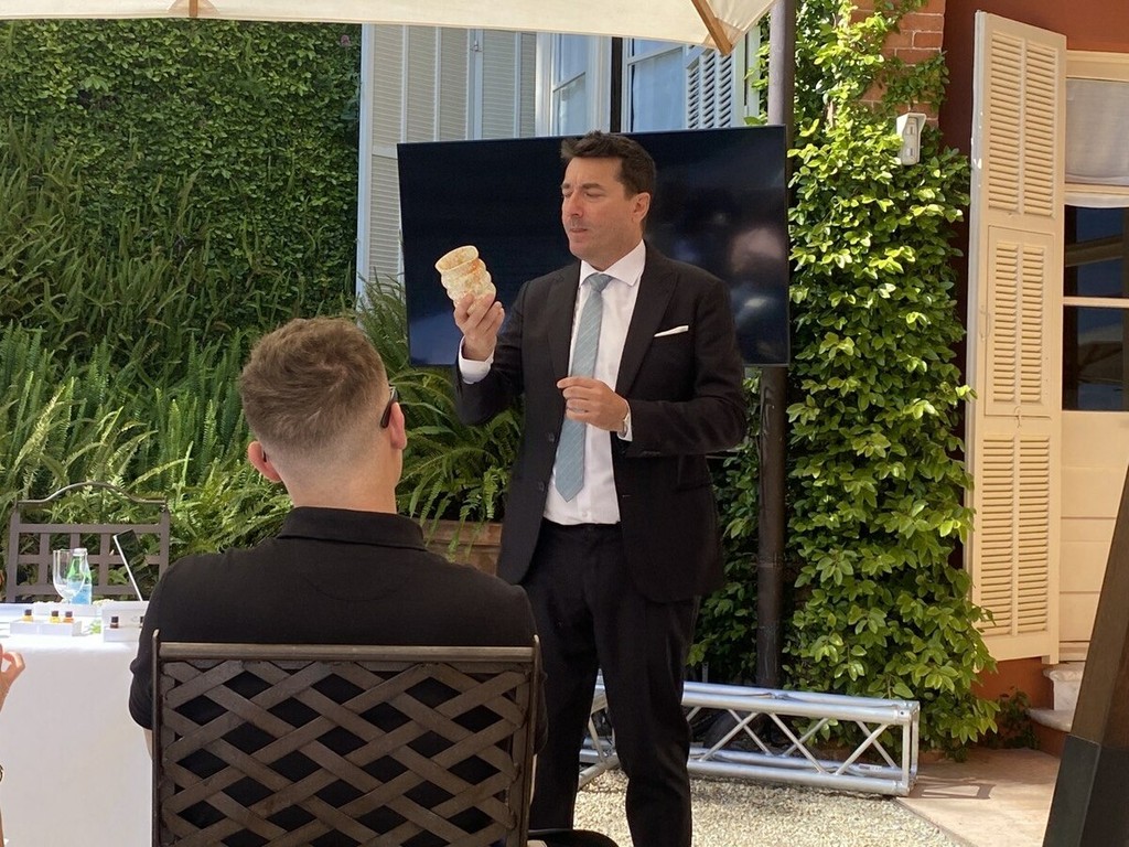 Il racconto affonda le radici nei giardini e nei laboratori di Cannes, dove Balestra coltiva un vero ecosistema aromatico: orti, alveari, serre e un laboratorio “segreto” in cui nascono “essenze commestibili”, parte di una star up che vedrà presto la luce. Qui la natura viene osservata, rispettata e trasformata con precisione scientifica: macerazioni ultrasoniche, distillazioni a bassa temperatura, blend che evocano paesaggi — bergamotto e basilico viola, rosa centifolia, mimosa (profumatissima), limone.