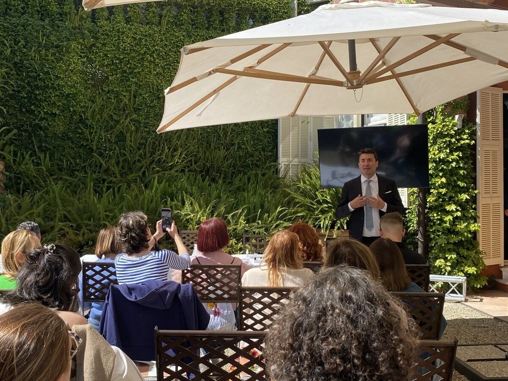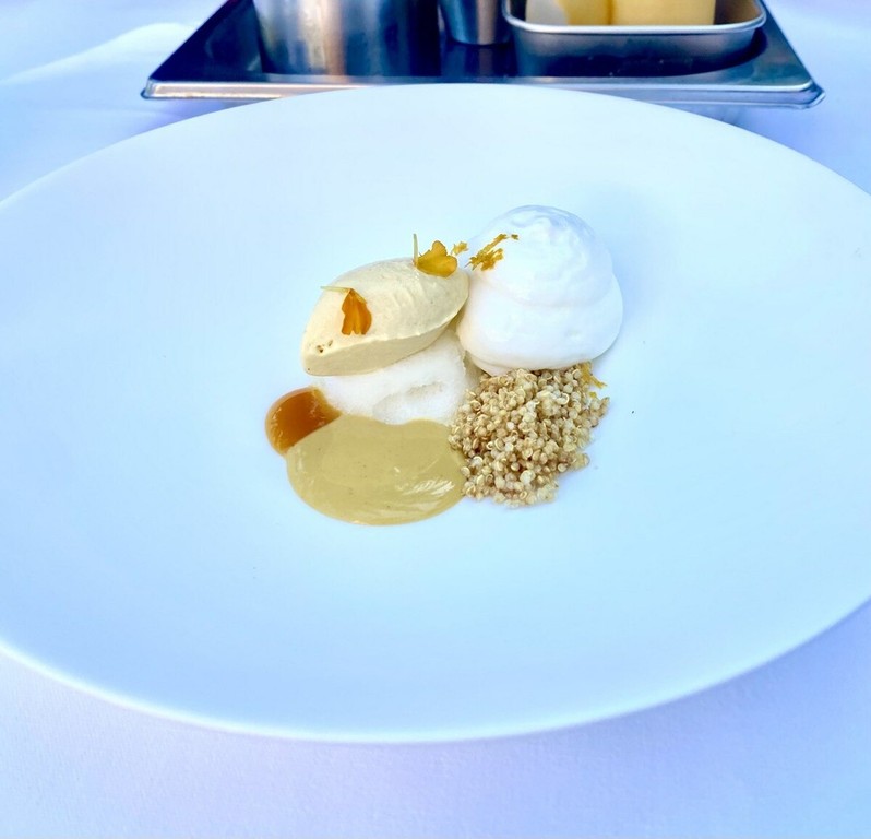 A chiudere la masterclass interviene la giovane pastry chef Rebecca Segna del Ristorante Nove (una stella Michelin), all’interno di Villa della Pergola, che propone un dessert perfettamente in dialogo con l’universo botanico di Balestra. Un piatto complesso e delicato: concentrato di arancia, meringa ghiacciata al limone, crema inglese al fiore di tagete, quinoa soffiata, gelato alla crema con marmellata di bergamotto dei giardini ossidato, spuma allo yogurt, scorza d’arancia e idrolato agrumato.