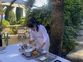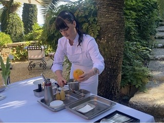 A chiudere la masterclass interviene la giovane pastry chef Rebecca Segna del Ristorante Nove (una stella Michelin), all’interno di Villa della Pergola, che propone un dessert perfettamente in dialogo con l’universo botanico di Balestra. Un piatto complesso e delicato: concentrato di arancia, meringa ghiacciata al limone, crema inglese al fiore di tagete, quinoa soffiata, gelato alla crema con marmellata di bergamotto dei giardini ossidato, spuma allo yogurt, scorza d’arancia e idrolato agrumato.