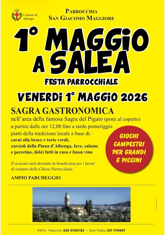 • 1° maggio a Salea. Tutto il giorno in Frazione Salea – area Sagralea, a cura della Parrocchia San Giacomo Maggiore