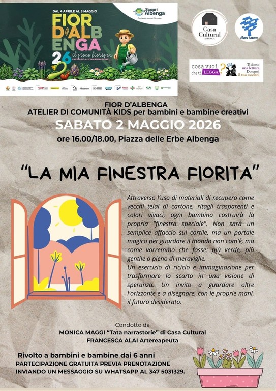 • “La mia finestra fiorita”. Orario 15.00–18.00 in Piazza delle Erbe, laboratorio gratuito per bambini. Prenotare al cell. 3475031329